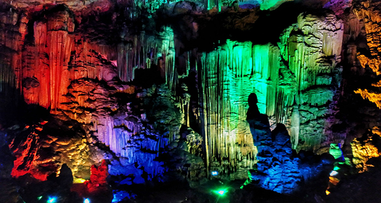 一個巨大的喀斯特溶洞,位于湖心島上。洞內空間開闊,鐘乳石形態(tài)各異,在五彩燈光的映襯下,呈現(xiàn)出光怪陸離的景象,仿佛進入了一個神秘的地下世界。洞內還有地下河,河水清澈見底。需乘船抵達島上,游覽時間約 1 小時,參觀時需跟隨導游,注意安全。