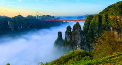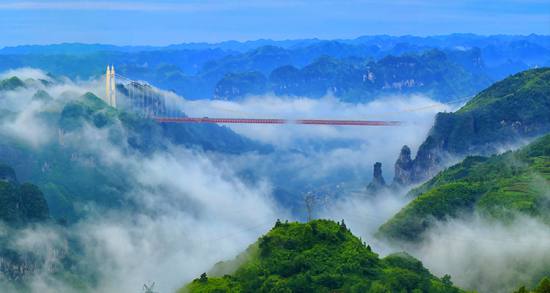 矮寨大橋飛越在德夯峽谷之巔,是世界跨峽谷跨徑最大的鋼桁梁懸索橋,大橋跨徑1176米,橋面距離峽谷底部355米。2007年10月開始修建,2012年3月建成通車,總造價15億元。大橋以克服了五大“世界級”施工難題和創(chuàng)造了四項“世界第一” 的高科技含量享譽中外,被贊為橋梁建筑藝術(shù)和自然景觀完美結(jié)合的典范。矮寨大橋不只是連接湘渝的重要交通設施,更是湘西的標志性景點。
