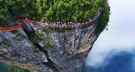 棧道全長(zhǎng)1600米,平均海拔為1400米,起點(diǎn)是倚虹關(guān),終點(diǎn)到小天門。與其他棧道不同的是,鬼谷棧道全線既不在懸崖之巔,也不在懸崖之側(cè),而是全線都立于萬(wàn)丈懸崖的中間,給人以與懸崖共起伏同屈伸的感覺。 站在棧道上俯瞰群山,古人“會(huì)當(dāng)凌絕頂,一覽眾山小”的感覺油然而生。由于天門山是國(guó)家森林公園,植被特別豐富,加上典型的喀斯特地貌,所以,在這條棧道上更能找到一種在乘坐直升飛機(jī)飛越熱帶雨林大峽谷的感覺,這平時(shí)只能在電影里看到的場(chǎng)景,在這里能讓你身臨其境。 由于海拔和氣流的影響,很多小鳥都不能到達(dá)與棧道平行位置。所以,站在這里,腳下是沒有邊際的綠野,成群的小鳥在峽谷中嬉戲,偶爾有老鷹從眼前掠過,閉上眼,挺著發(fā)麻的雙腿,帶著急促的心跳,伸開雙臂,你就能得到一次最完美、最刺激、最貼近自然的SPA。因?yàn)?,要知道這種在懸崖上賞風(fēng)景一般都是非人類所能享受的。 如果是雨前雨后,在棧道上則是身邊霧氣盤繞,腳下云海翻騰,令人抬腿似生霧,邁步如踏云,人間天界,世外洞天也就是如此了。 據(jù)施工人員介紹,此條棧道也是他們所修棧道中施工最難,最險(xiǎn)峻的一條。如果您還覺得不夠刺激的話,在棧道的完結(jié)處的兩個(gè)懸崖之間有一條長(zhǎng)160米的懸索吊橋,同時(shí),在海拔最高點(diǎn)還有一個(gè)挑戰(zhàn)心里極限的玻璃站臺(tái),在這里,如果你能挺直腰板伸開雙臂,那么,您就是真正的勇士了。