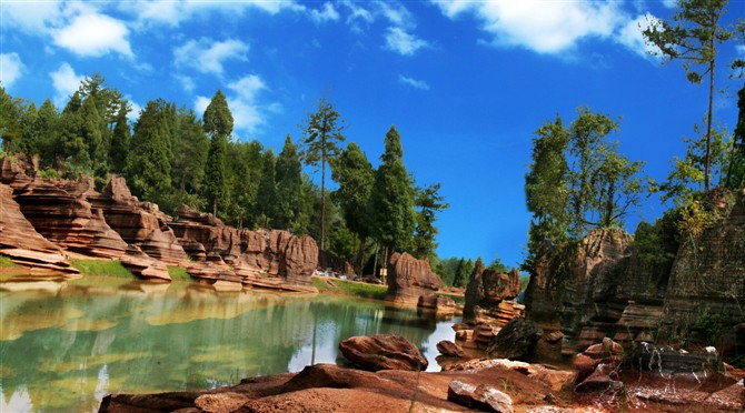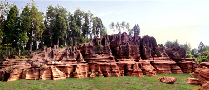 據(jù)地質(zhì)專家考證:紅色石林巖石形成的歷史約4。5億年,地質(zhì)史上稱之為揚(yáng)子古海(海底沉積了大量混合泥沙的碳酸鹽物質(zhì),經(jīng)地殼運(yùn)動和侵蝕、溶蝕作用形成了這片美麗的地質(zhì)奇觀)。景區(qū)內(nèi)遍布高大奇石,造型各異、顏色變化多端,且隨天氣、時間、季節(jié)變化而變化,晴紅雨黑、陰轉(zhuǎn)褐紅、晨昏有別。 景區(qū)內(nèi)石景有:蜀犬吠日、乳燕待哺、樓蘭古城、蝸牛搬家、七彩迷宮、利劍刺空、航母巡游、石兵列陣、少女出浴、觀音坐蓮、石鞭候主、靈龜探海、粽熊迎客、天狗吠日、水獺望云、母雞搗窩、駝鈴聲聲····尤以“巨人圓”、“古城故宮”、“八卦奇陣”、“諸葛藏書”為奇石絕景中的最佳。 景區(qū)內(nèi)還有地下溶洞、絕壁天坑、神秘地坑、千年古木、土家山寨、土風(fēng)民俗、集商遺址····